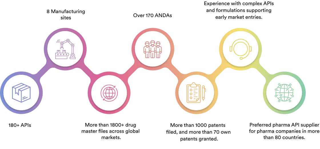 We specialise in manufacturing and supplying a wide range of APIs for generic formulation manufacturers in India and overseas. The company has a diversified portfolio of 150+ active pharmaceutical ingredients, which are used in major therapeutic areas such as gastrointestinal, cardiovascular, diabetology, oncology, pain management, and dermatology. Our API manufacturing facilities adhere to cGMP (ICH Q7) and are inspected on a regular basis by international regulatory bodies. We have eight commercially inspected USFDA production plants, six in India and one each in Mexico and the United Kingdom.